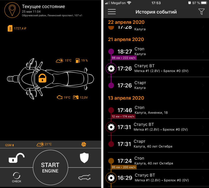 Это вполне объяснимо – настолько функционального мобильного приложения для мототехники еще не существовало. Полный контроль текущего состояния мотоцикла, включая температуры, контроль бортового напряжения и всех возможных статусов. История событий (более 10 типов), ну и, конечно же, уникальная история поездок – трекинг. Максимально точный, подробный, с автоматической адаптацией своих алгоритмов работы в зависимости от скорости движения мотоцикла, с режимом отслеживания и фиксацией максимальной скорости который позволяет делиться своими, документированными в отчетах, рекордами с собратьями по увлечению.