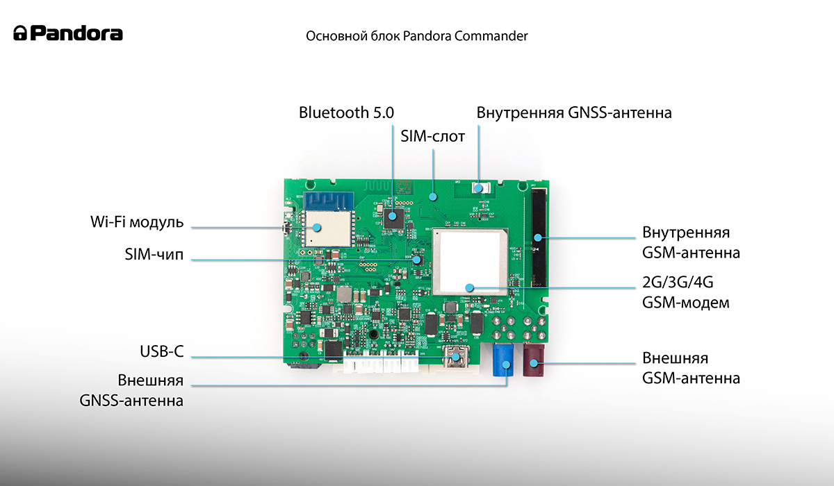 Pandora Commander построен на революционной программно-аппаратной платформе FX нового поколения и обладает рекордным набором интерфейсов связи на борту с современнейшим многодиапазонным (4G/3G/2G) GSM-модемом, встроенным модулем WiFi, Bluetooth 5.0-интерфейсом, встроенным высокочувствительным GPS/ГЛОНАСС-приемником и радиотрактом на 868 МГц LoRa.