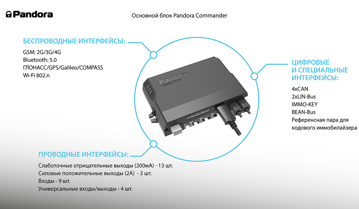 При этом, Pandora Commander обладает широчайшим набором специализированных портов из 20 выходов и 14 входов для воплощения самых смелых и сложных авторских установок. Также система имеет отдельный вход валидатора для дополнительной авторизации владельца и возможность развернуть внешнее антенное GSM/GPS хозяйство в условиях серьезных помех и экранированности сигнала.