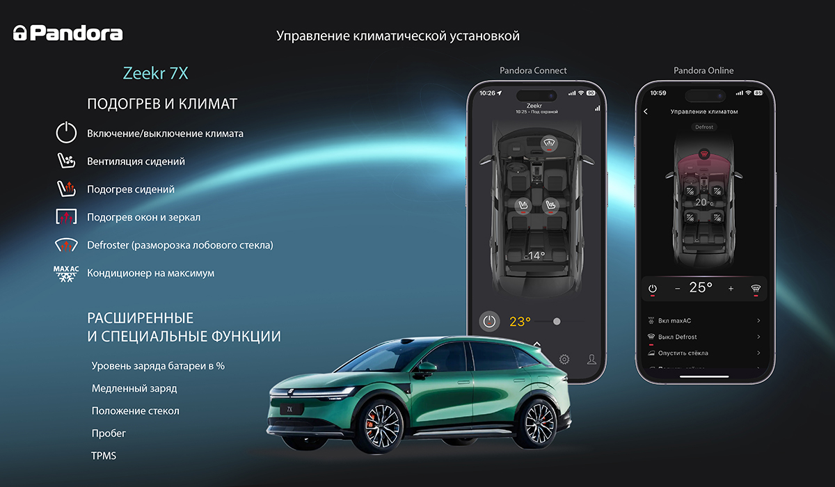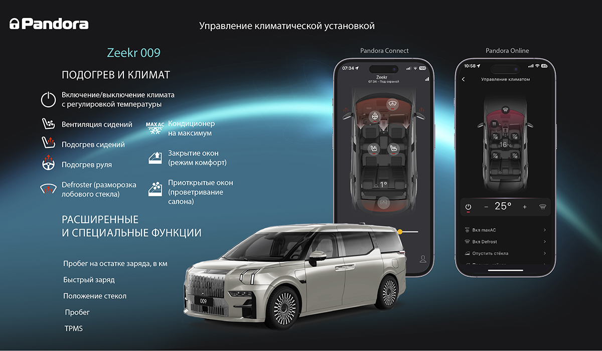 Эти модели построены на модифицированной интеллектуальной платформе с обновленной архитектурой, и теперь только пользователи Pandora вправе рассчитывать на доступ к полному спектру удаленного управления продвинутой климатической системой: включать и регулировать температуру климата, активировать подогрев и вентиляцию сидений, подогрев окон и зеркал, разморозку лобового стекла и даже запускать режим максимального кондиционирования. Управление с нашего фирменного приложения (Pandora Connect или Pandora Online) намного удобнее – просто открыл приложение и Pandora практически мгновенно исполняет команды. Для Zeekr 009 добавлены функции «проветривание салона» и «комфорт», которые позволяют приоткрыть или поднять окна для естественной циркуляции воздуха.