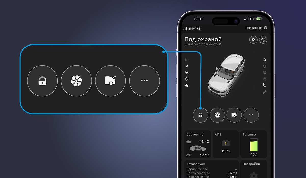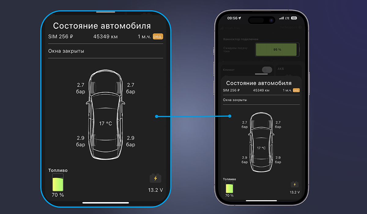 Также добавлено отображение расширенного состояния автомобиля — при коротком тапе на плитку-виджет на главном экране теперь всплывает окно, в котором отображаются пробег автомобиля, баланс SIM-карты, состояние охранных зон, температуры салона, двигателя и окружающей среды, а также состояния расширенных статусов: открыты или закрыты окна, низкий уровень стеклоомывателя и, конечно же, давление в шинах — как штатных, которые наши системы умеют контролировать по CAN-шине, так и дополнительных, с которыми система работает по прямому Bluetooth-каналу.